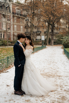 冬天是較為適合拍便服的,因為可以在便服底層再穿上更厚的衣服打底。不過如果你一定要這個時候拍攝的話,建議還是帶多一套便服,萬一到時頂不住寒冷及雨水的話,也可以有一套後備衣服換上拍攝,跟巴黎的天氣及冬天氣氛也很配合的。當長裙或婚紗吸到地上積水,你會變得更冷。在太冷的情況下穿很少,客人不容易控制一個自然開心的表情,而這些是不能在後期製作更改的。很多客人不明白冬天拍攝情況可以有多壞,不過我會為我的客人準備一系列的溫馨提示。